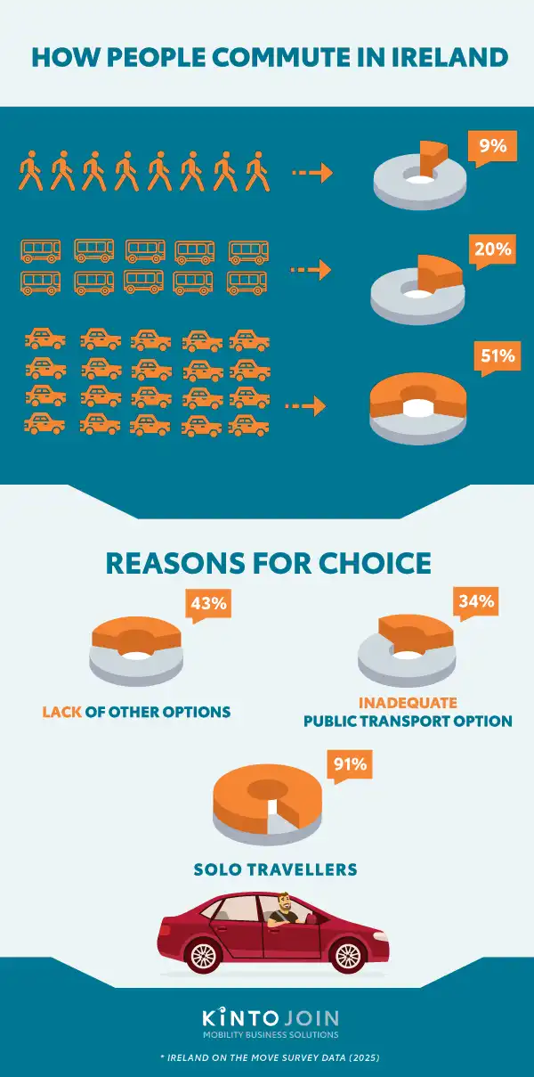 The “Ireland on the Move” survey shows similar statistics. It highlighted that driving by car is the primary mode for 51% of commuters, and crucially, 91% of car commuters travel solo.
