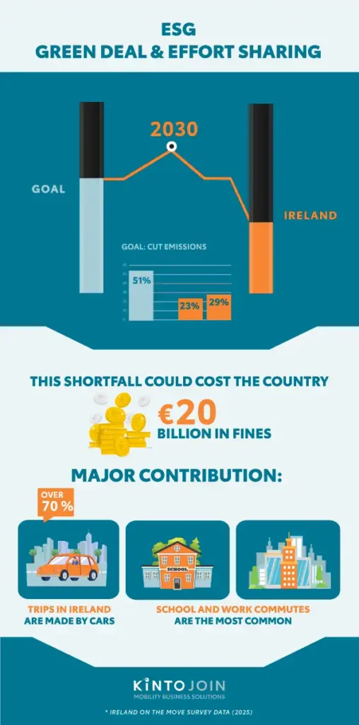 Ireland lags significantly behind its EU peers in meeting its Green Deal and Effort Sharing Regulation targets, currently projected to cut emissions by just 23–29% by 2030, far below the legally binding 51% target, a shortfall that could cost the country up to €26 billion in fines or carbon credits. A major contributor to this emissions gap is transport: over 70% of trips in Ireland are made by car, even for journeys under 2 km.